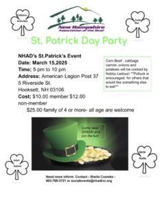 NHAD St. Patrick’s Day Party Date: March 15th, 2025 Time: 5:00 PM to 10:00PM Address: American Legion Post 37, 5 Riverside St, Hooksett NH 03106 Cost: Member = $10; non-member = $12; family of 4 or more = $25 Corned beef, cabbage, carrots, onions, potatoes will be cooked by Nobby Ledoux! Potluck is encouraged for […]
